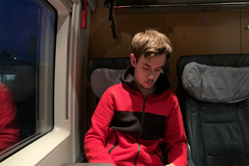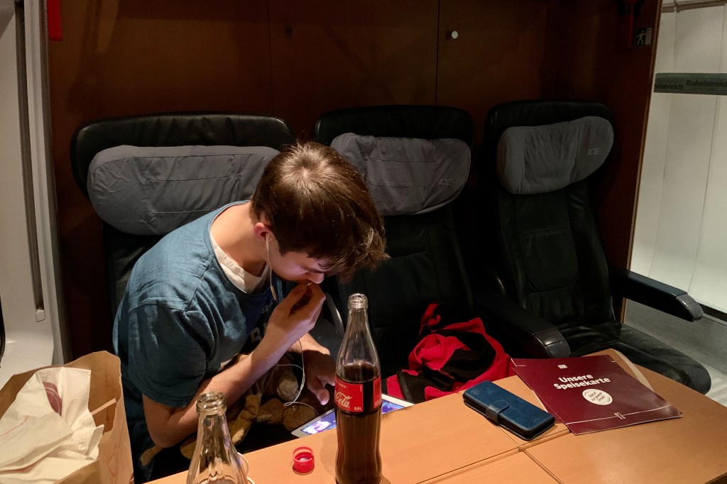Sander kan niet lezen, maar ergens eind van de middag zag hij “Amsterdam” boven een perron staan. We gingen maar weer eens kijken. Het was inderdaad een ICE die richting Amsterdam zou gaan. De conducteur gaf wel aan dat er weinig kans was dat zij ook aan zouden komen. Er was nog steeds overal hommeles met bomen op het spoor en kapotte bovenleidingen. We besloten in die trein te gaan zitten. Sander helemaal blij want we gingen naar huis. Ik ongerust, want geen idee waar we zouden stranden en dat kon wel eens diep in de nacht gebeuren.